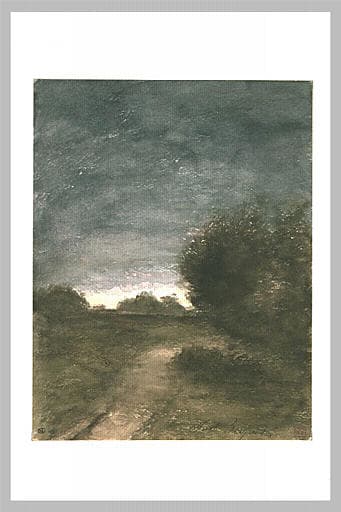 Chemin au crépuscule, bordé d'arbres et de massifs d'arbres
