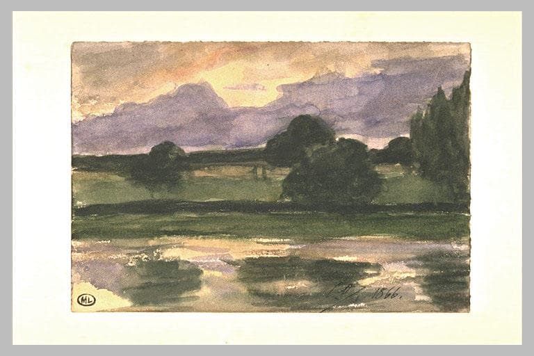 Etang reflétant les nuages violacés du ciel ; au delà, prairie et arbres