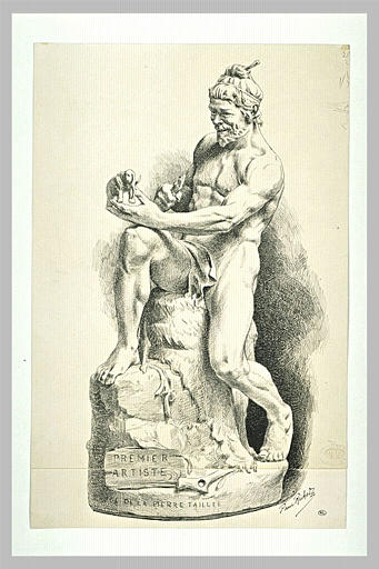 Sur la statue inscriptions : premier artiste. Age de la pierre taillée. Signé en bas, à droite : Paul Richer