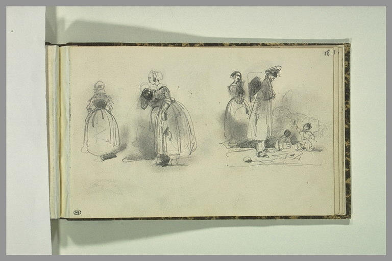 Album Adam Victor, folio 18, dessiné au recto ; Album factice (anciennement album vrai). Cartonné, plats en papier marbré, étiquette rouge au dos portant l'inscription :ADAM (VICTOR). Feuillets remontés sur onglet. Scènes de la vie réelle et personnages de théâtre. H. 0,140 ; L. 0,240