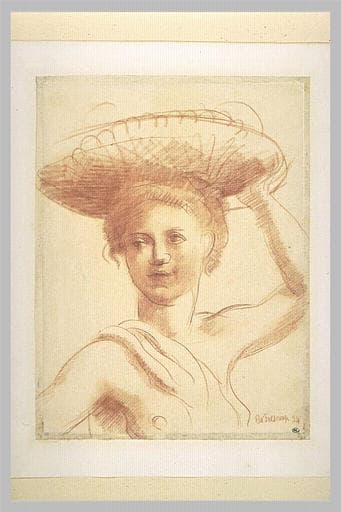 Jeune femme en buste, maintenant de la main gauche une corbeille sur sa tête
