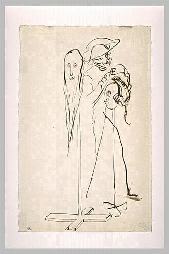 Homme coiffé d'un bicorne s'affairant autour de têtes coiffées de perruques