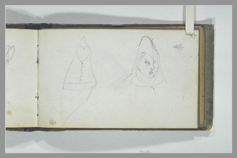 Album Delacroix Eugène -23-, folio 27, dessiné au recto ; Album cartonné recouvert de papier gris-brun verdâtre, avec dos de peau verte, composé de 42 feuillets de différentes couleurs. Les feuillets 36, 38 sont détachés. Les folios 35, 36, 40, 41 sont vierges. H. 0,095 ; L. 0,150
