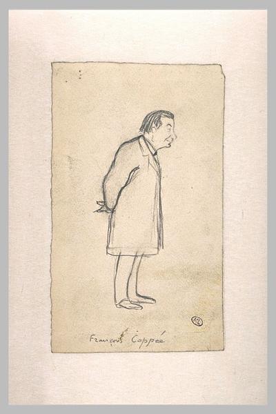 Croquis caricatural d'un homme, de profil, mains derrière le dos : François Coppée