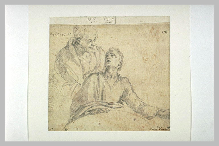 Pierre noire et sanguine. Annotations à la plume et à l'encre brune, en bas à droite :Franc. Salviati', à gauche : 1550 ; à la pierre noire, en haut à gauche :Salviati