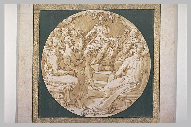E. Jabach (L. 2959) ; montage à bande dorée des dessins d'ordonnance ; Inventaire Jabach, III, n° 285 (Zuccaro) - Entré dans le Cabinet du Roi en 1671 ; paraphe de J. Prioult (L. 2953).