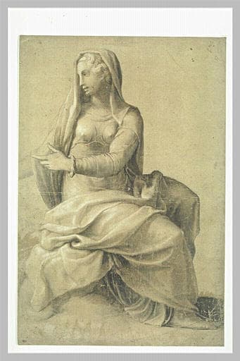 Femme drapée, assise, regardant à gauche