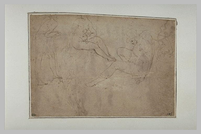 Guerrier ; femme nue, assise ; figure s'appuyant sur un baton ; homme drapé