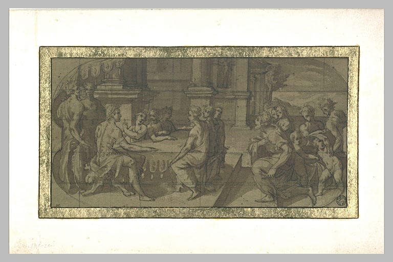 Réunion de sept figures autour d'une table et groupe de suppliants