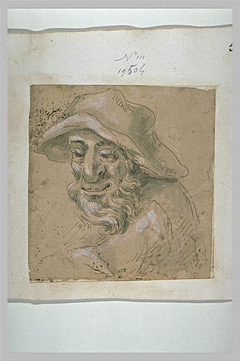 Tête de vieillard, coiffée d'un chapeau, souriant