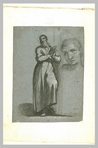 Un religieux debout, les mains jointes ; une tête