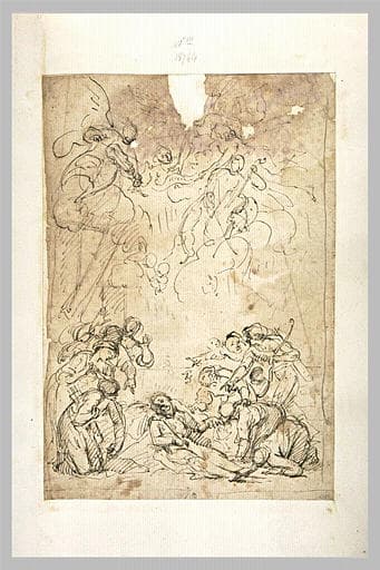 scène (saint François Xavier, mort, crucifix, Indien, arc, carquois, ange : musicien, violon, violoncelle)