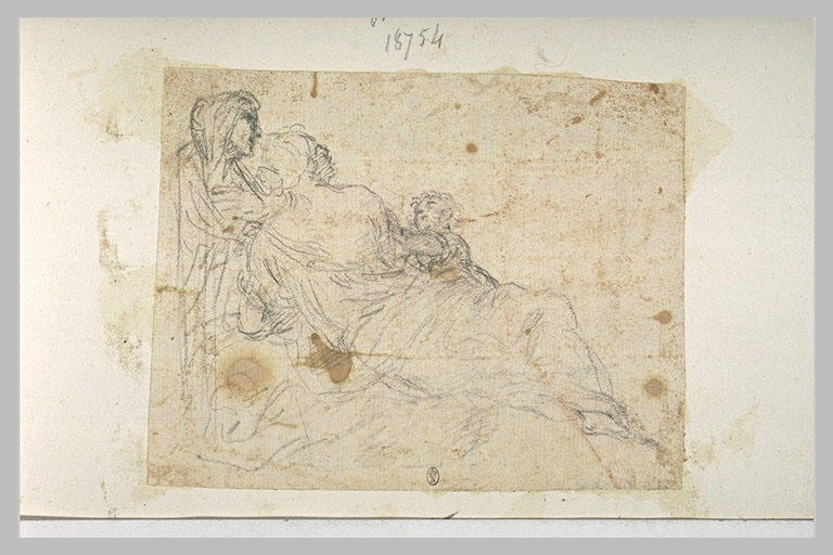 Jeune femme couchée, vue de dos, avec un enfant et une vieille femme