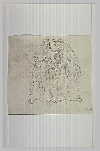 P. Crozat ? (montage LBS O66) -- A.J. Dezallier d'Argenville, au recto, paraphe 820 et numéro (L.2951) en bas au centre et annotation à la pierre noire en bas à gauche :'S. Ricci, au verso, numéro et paraphe en bas à droite ; sa vente, Paris, 18-28 janvier 1779, partie du lot 172 ou 178 (Sebastien Ricci) -- Ch.P. de Saint-Morys, annotations à la plume et encre brune sur le montage : Sebast. Ricci / Ecole Venitienne et au verso : La Justice sur des nuages avec / des génies à la plume lavé d'encre / de la chine / au revers la rencontre de St François / et de St Dominique dessin à la plume -- Saisie des biens des Emigrés en 1793, remise au Museum en 1796-1797 ; marque du Louvre (L.1886).