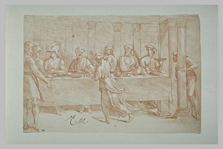 Contre-épreuve d'une copie d'après un dessin du Musée du Louvre (INV 4310) copiant lui-même un dessin perdu de Raphaël, représentant peut-être un Banquet d'Alexandre le Grand (P. Joannides, com. orale) plutôt que Vulcain regardant Hébé servir l'ambroisie aux dieux (Morel d'Arleux, n° 2720) ou Pénélope et ses prétendants. D. Cordellier, B. Py, Musée du Louvre - Inventaire des dessins italiens - V. Raphaël, son atelier, ses copistes, Paris, 1992