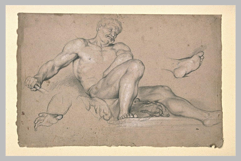 Etude pour un des stucs feints, représentés à la voûte de la galerie de l'hôtel Lambert. L'attitude d'Hercule sera modifiée dans la peinture ; comme l'indique la légende des planches gravées, il sera vu enchaînant le chien Cerbère qui avoit trois têtes et gardoit la porte des Enfers. La massue sera posée à terre et le bras droit occupé à cette action. Le pied gauche, coupé par la marge du papier, est repris en haut à droite ; la modification de la main droite ne sera pas retenue dans la peinture. On retrouve ici le même style que dans les autres études pour les stucs, avec un jeu d'ombre et de lumière suggérant une sculpture vue par en dessous. (L. Beauvais, Musée du Louvre, Département des Arts graphiques, Inventaire général des dessins, Ecole française, Charles Le Brun, 1619-1690, tome I, Paris, RMN, 2000, n° 23, p. 37) La voûte de la galerie a été gravée par Bernard Picart, en sens inverse, puis par Matthys Pool. Une planche gravée par ce dernier est conservée au Cabinet des estampes de la bibliothèque nationale de Paris