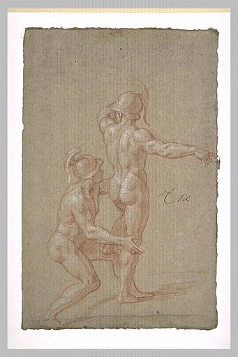 Etude pour La Bataille de Porus, tableau non exécuté, illustrant l'Histoire d'Alexandre. Verdier a peint un tableau d'après la pensée de Le Brun, en vue de la suite de tapisseries de L'Histoire d'Alexandre exécutées aux Gobelins. Plusieurs planches ont été gravées d'après La Bataille de Porus : par J. Audran, présentant des figures vêtues, et par J. -H. Martin (BnF, est., Da 36, fol. 44), présentant les figures nues, comme dans l'ébauche de Le Brun, aujourd'hui disparue. Le succès des Reines de Perse - peint par Le Brun à la demande de Louis XIV, à Fontainebleau, en 1660-1661 - incite l'artiste à entreprendre un grand cycle sur la vie d'Alexandre, il réalise plusieurs toiles entre 1665 et 1673. Le Cabinet des dessins du Louvre conserve plus de deux cents dessins relatifs aux peintures et projets de L'Histoire d'Alexandre. Etude pour Alexandre, debout au milieu d'un groupe, au fond à gauche de la composition. (...) Après plusieurs recherches peu satisfaisantes (cf. Inv. 27728), l'aide apportée à Alexandre pour lui permettre d'enfourcher son nouveau cheval vient d'un guerrier de sa suite qui, accroupi, lui offre le secours de sa jambe. (Beauvais, Louvre, Inventaire général des dessins, Ecole française, Charles Le Brun, 1619-1690, tome I, 2000, n° 1934, p. 527)