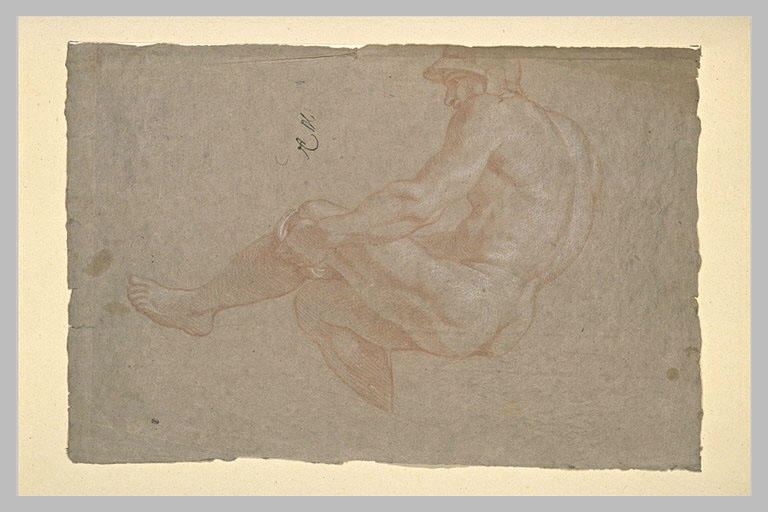 Contre-épreuve de sanguine, avec rehauts de craie blanche, sur papier gris-beige. Bords irréguliers