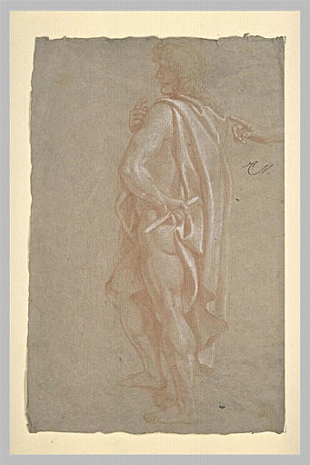 figure (homme, debout, de profil, draperie) ; expression du corps (main)