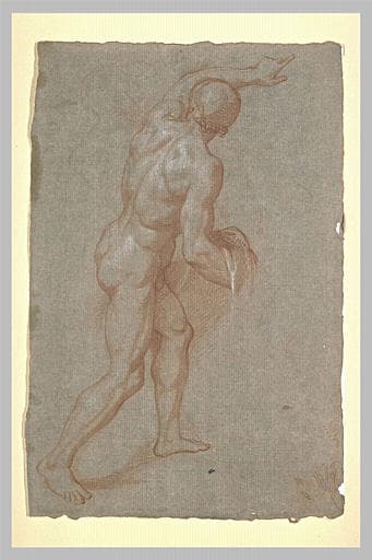 Etude pour Alexandre et Porus ou La Défaite de Porus (musée du Louvre, Inv. 2897). Après la victoire d'Alexandre sur Porus - au terme de la bataille menée sur les bords de l'Hydaspe (Jhelam ou Jhelum) - ce dernier est amené devant le vainqueur. Le tableau fut gravé par Gérard Audran (cuivre à la Chalcographie, n° 1000). Le succès des Reines de Perse - peint par Le Brun à la demande de Louis XIV, à Fontainebleau, en 1660-1661 - incite l'artiste à entreprendre un grand cycle sur la vie d'Alexandre, il réalise plusieurs toiles entre 1665 et 1673. Le Cabinet des dessins du Louvre conserve plus de deux cents dessins relatifs aux peintures de L'Histoire d'Alexandre, dont une soixantaine concernant le tableau d'Alexandre et Porus. Etude pour un guerrier casqué et en armure, à gauche de Porus. Il a ramassé le bas de l'ample manteau du roi indien et le soutient sur son bras. (Beauvais, Louvre, Inventaire général des dessins, Ecole française, Charles Le Brun, 1619-1690, tome I, 2000, n° 1866, p. 508) Dessin portant au verso une autre étude pour le tableau