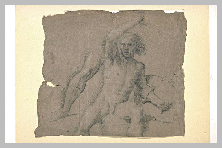 Etude pour La Bataille d'Arbelles (musée du Louvre, Inv. 2895). Le tableau fut gravé par Gérard Audran (cuivre à la Chalcographie, n° 998). La bataille se déroula dans la plaine de Gaugamèles, près d'Arbelles. Il s'agit de la dernière grande bataille d'Alexandre contre Darius. Le succès des Reines de Perse - peint par Le Brun à la demande de Louis XIV, à Fontainebleau, en 1660-1661 - incite l'artiste à entreprendre un grand cycle sur la vie d'Alexandre, il réalise plusieurs toiles entre 1665 et 1673. Le Cabinet des dessins du Louvre conserve plus de deux cents dessins relatifs aux peintures de L'Histoire d'Alexandre, dont une cinquantaine pouvant concerner La Bataille d'Arbelles. Etude pour la figure nue de Darius, assis sur son char ; il est vu ici sous les traits d'un jeune homme qui sera vieilli dans la peinture. La jambe droite coupée par la marge du papier est étudiée séparément, à gauche. (Beauvais, Louvre, Inventaire général des dessins, Ecole française, Charles Le Brun, 1619-1690, tome I, 2000, n° 1783, p. 488)