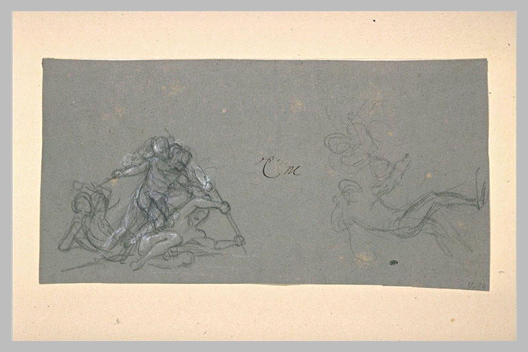 Après la mort de Colbert (1683), Le Brun peint en 1686 et 1687 deux tableaux sur l'histoire de Moïse, que Poussin avait souvent traitée : Moïse défend les filles de Jéthro et Moïse épouse Séphora. Il espère ainsi forcer l'admiration du roi malgré la cabale menée contre lui par Louvois et Mignard. Les deux tableaux, gravés par Benoît I Audran avant 1701, sont conservés à Modène (Galleria Estense). Dans le tableau Moïse défend les filles de Jéthro, le groupe de Moïse est directement inspiré par la composition de Poussin sur le même thème. Etudes pour Moïse aux prises avec les bergers : à gauche, étude précise du groupe tel qu'il apparaît dans la première pensée pour l'ensemble du tableau (Inv. 29476) ; à droite, en tournant la feuille, croquis pour Moïse et deux de ses adversaires, avec des variantes par rapport à la première étude. (...) (L. Beauvais, Musée du Louvre, Département des Arts graphiques, Inventaire général des dessins, Ecole française, Charles Le Brun, 1619-1690, tome I, Paris, RMN, 2000, n° 1174, p. 341)