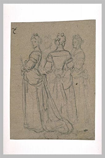 Les dessins rattachés à la tenture de L'Histoire du Roy peuvent être répartis en 3 séries. La première, tissée à partir de 1665 aux Gobelins, évoque des épisodes de la Guerre de Dévolution ainsi que des épisodes civils ou diplomatiques. La deuxième a pour sujet des épisodes de la Guerre de Hollande, dont le passage du Rhin, mais aucune tenture n'a été tissée. La troisième, non tissée, pourrait faire partie d'un projet d''Histoire galante du Roi. Collaboration de Van der Meulen et de Verdier. En relation à la tenture, un grand dessin de Le Brun, conservé à l'Ecole nationale supérieure des Beaux-arts à Paris est un projet de tapisserie non réalisé. De même style que le dessin évoquant la Réception de Louis XIV à l'Hôtel de Ville de Paris (Inv. 29627), il relate un événement tardif de la vie de Louis XIV, la réception des ambassadeurs de Siam, ayant eu lieu dans la Grande Galerie de Versailles le 01 septembre 1686. Dessin de l'atelier, repris partiellement à la pierre noire, sur un calque de même technique et dont les traits sont repassés au stylet, en vue d'un report. C'est une étude pour le groupe de femmes de la cour, au premier plan à droite, dans le projet de tapisserie évoquant la réception par Louis XIV des ambassadeurs de Siam, dans la Grande Galerie de Versailles. (L. Beauvais, Musée du Louvre, Département des Arts graphiques, Inventaire général des dessins, Ecole française, Charles Le Brun, 1619-1690, tome II, Paris, RMN, 2000, n° 2551, p. 739)