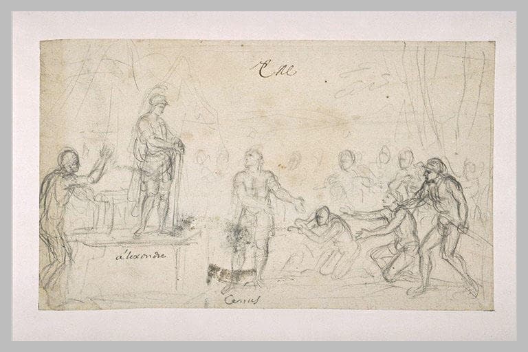 Etude pour Alexandre et Cénus, tableau non exécuté, illustrant l'Histoire d'Alexandre. Le succès des Reines de Perse - peint par Le Brun à la demande de Louis XIV, à Fontainebleau, en 1660-1661 - incite l'artiste à entreprendre un grand cycle sur la vie d'Alexandre, il réalise plusieurs toiles entre 1665 et 1673. Le Cabinet des dessins du Louvre conserve plus de deux cents dessins relatifs aux peintures et projets de L'Histoire d'Alexandre. (...) Le Brun se proposait de représenter (...) (un épisode) qui se place après la conquête de l'Inde. Nivelon ne fait pas mention de ce projet, mais Le Brun a pris soin d'indiquer les noms des deux principaux personnages de la scène. Ici encore, la composition est conforme au récit de Quinte-Curce (Livre IX, III, p. 663, 664). Alexandre, debout sur une tribune, fait face à Cénus qui a enlevé son casque (...) et qui prononce son discours sur la lassitude de l'armée macédonienne, en désignant les officiers et les soldats dont il est le porte-parole. (Beauvais, Louvre, Inventaire général des dessins, Ecole française, Charles Le Brun, 1619-1690, tome I, 2000, n° 1915, p. 520)