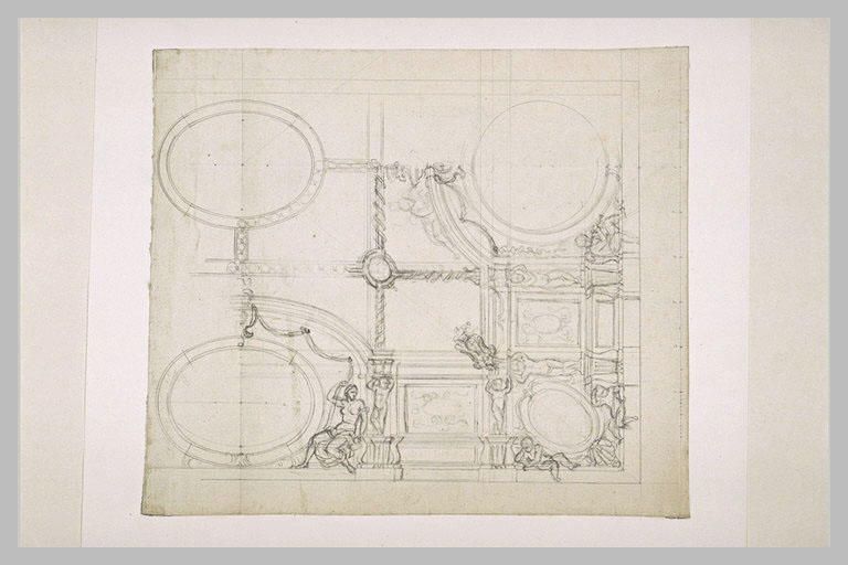 Recherche de décor pour l'angle d'un plafond à caissons, ménageant des médaillons de forme ovale ou circulaire. Ce projet est peut-être en rapport avec un des plafonds du palais des Tuileries, mais il ne peut être formellement identifié. (L. Beauvais, Musée du Louvre, Département des Arts graphiques, Inventaire général des dessins, Ecole française, Charles Le Brun, 1619-1690, tome I, Paris, RMN, 2000, n° 1121, p. 324)