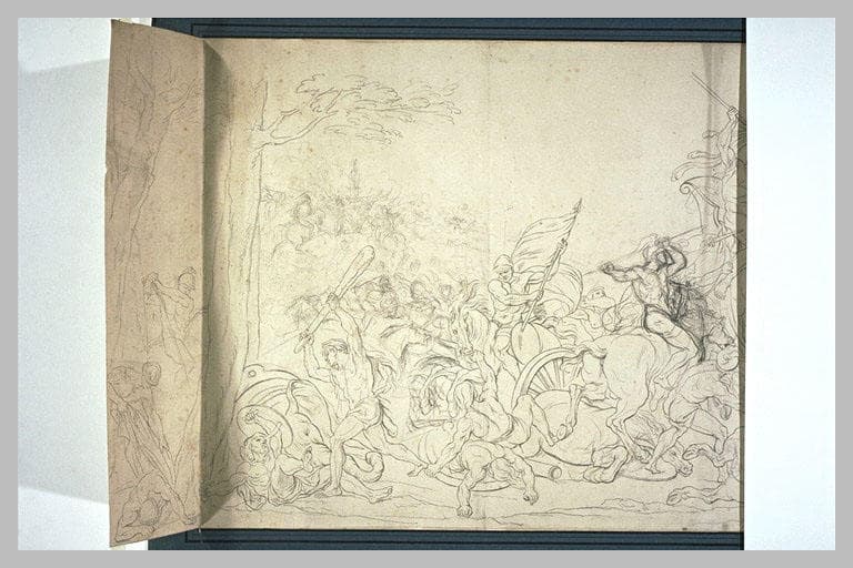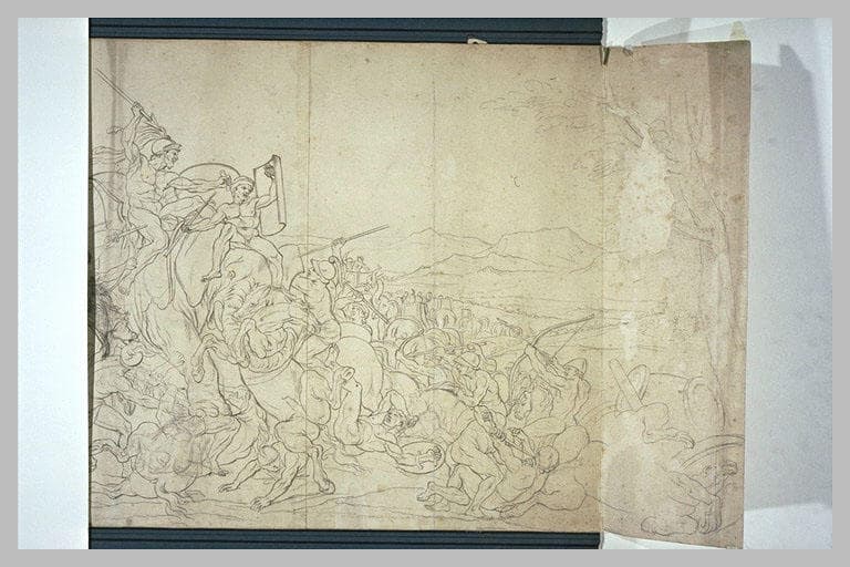 Copie calquée de La Bataille de Porus (projet non réalisé de Le Brun), probablement à partir du même dessin que le n° 1931 (Inv. 29424). Presque toutes les figures sont reprises, au trait, à la pierre noire, par un collaborateur de l'atelier. Le groupe d'Alexandre, au dernier plan à gauche, est encore à l'état d'ébauche. (Beauvais, Louvre, Inventaire général des dessins, Ecole française, Charles Le Brun, 1619-1690, tome I, 2000, n° 1932, p. 526) Le projet, non réalisé, pour La Bataille de Porus, illustre l'Histoire d'Alexandre. Verdier a peint un tableau d'après la pensée de Le Brun, en vue de la suite de tapisseries de L'Histoire d'Alexandre exécutées aux Gobelins. Plusieurs planches ont été gravées, par J. Audran, présentant des figures vêtues, et par J. -H. Martin (BnF, est., Da 36, fol. 44), présentant les figures nues, comme dans l'ébauche de Le Brun, aujourd'hui disparue. Le succès des Reines de Perse - peint par Le Brun à la demande de Louis XIV, à Fontainebleau, en 1660-1661 - incite l'artiste à entreprendre un grand cycle sur la vie d'Alexandre, il réalise plusieurs toiles entre 1665 et 1673. Le Cabinet des dessins du Louvre conserve plus de deux cents dessins relatifs aux peintures et projets de L'Histoire d'Alexandre