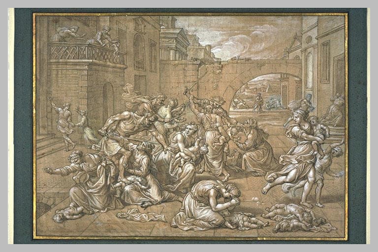 La gravure de Marcantonio Raimondi (Bartsch illustré, 1978, vol. 26, p. 29, n° 18-1) offrait un modèle bien connu pour une telle composition. Mignard en reprend certaines attitudes qu'il inverse et modifie et dont la plus remarquable est sûrement celle de la femme qui, à droite cherche à s'échapper en regardant par-dessus son épaule. D'un autre côté, le dessin garde comme un écho de L'Incendie du bourg où, de part et d'autre d'un dallage dont les lignes de fuite mènent à un arrière-plan plus ouvert, des architectures imbriquées se peuplent de personnages qu'emporte le mouvement général. (Grand-Palais, 1984)