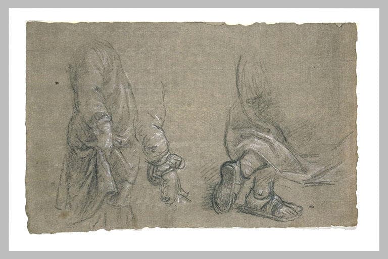 Figure drapée ; reprise du bras ; draperie reposant sur des pieds