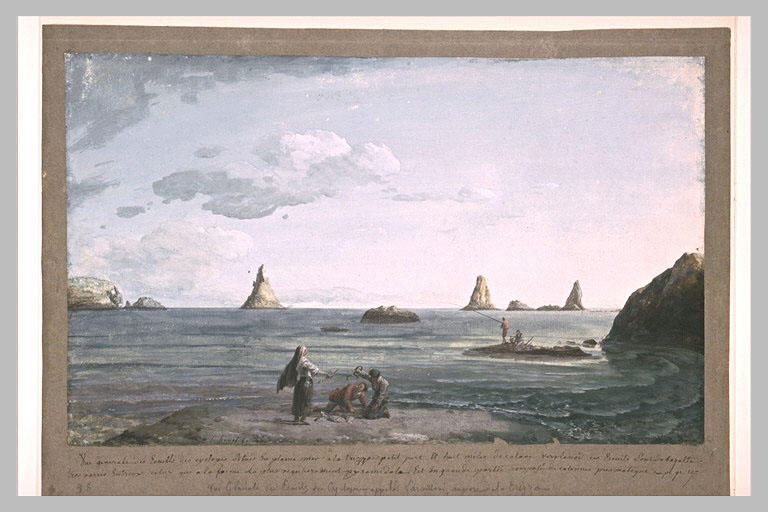Ce dessin fait partie d'une série de 46 gouaches pour le Voyage pittoresque des isles de Sicile, de Malte et de Lipari, où l'on traite des Antiquités qui s'y trouvent encore ; des principaux Phénomènes que la Nature y offre ; du Costume des Habitans, & de Quelques Usages par Jean Houel, Peintre du Roi, à Paris. Gravé dans le volume II, planche CVII.