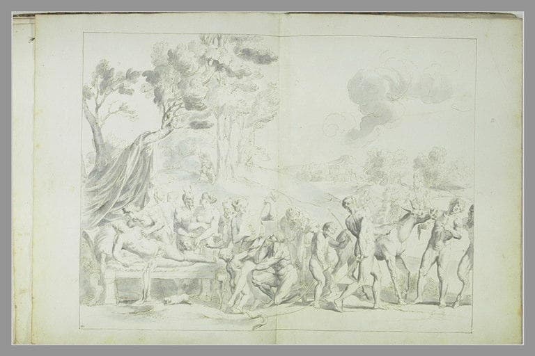 scène mythologique (Ariane, sommeil, Bacchus, Silène, âne, faune) ; fond de paysage