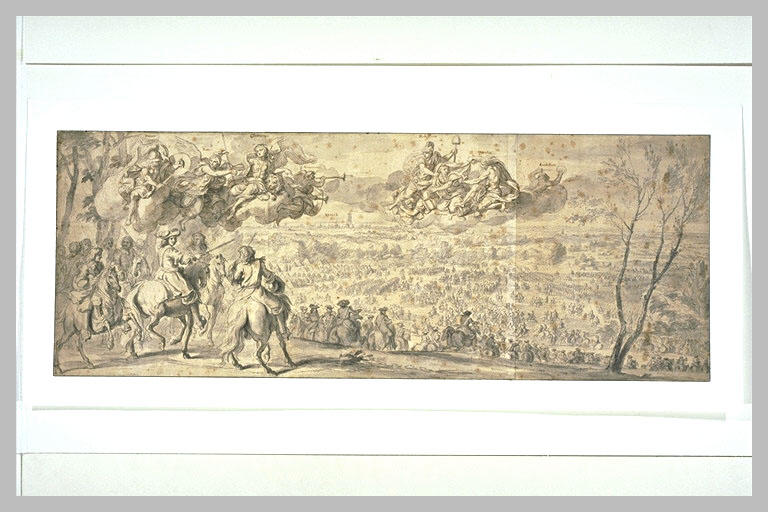 Les dessins rattachés à la tenture de L'Histoire du Roy peuvent être répartis en 3 séries. La première, tissée à partir de 1665 aux Gobelins, évoque des épisodes de la Guerre de Dévolution ainsi que des épisodes civils ou diplomatiques. La deuxième a pour sujet des épisodes de la Guerre de Hollande, dont le passage du Rhin, mais aucune tenture n'a été tissée. La troisième, non tissée, pourrait faire partie d'un projet d'Histoire galante du Roi. Les dessins en rapport avec L'Histoire du Roy sont caractérisés par la collaboration de plusieurs artistes de l'atelier, dont Adam-Frans Van der Meulen pour les arrières-plans et François Verdier pour certaines figures allégoriques. Autre projet de tapisserie de l'Histoire du Roi, associant une scène historique et des figures allégoriques, mais jamais tissé. (...) Un dessin de Van der Meulen, au Louvre (Inv. 20069 ; Lugt 845), paraît correspondre (au présent dessin). (...) la scène historique à la pierre noire et le panorama à la mine de plomb sont dus à Van der Meulen. Seules les figures allégoriques (...) sont de la main de Le Brun. (...). (L. Beauvais, Musée du Louvre, Inventaire général des dessins, Ecole française, Charles Le Brun, 1619-1690, tome II, Paris, 2000, n° 2546, p. 736)