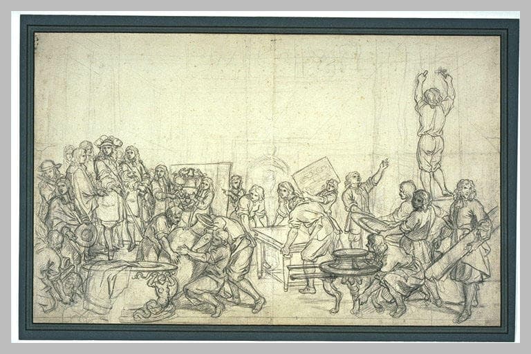 Les dessins rattachés à la tenture de L'Histoire du Roy peuvent être répartis en 3 séries. La première, tissée à partir de 1665 aux Gobelins, évoque des épisodes de la Guerre de Dévolution ainsi que des épisodes civils ou diplomatiques. La deuxième a pour sujet des épisodes de la Guerre de Hollande mais aucune tenture n'a été tissée. La troisième, non tissée, pourrait faire partie d'un projet d'Histoire galante du Roi. Les dessins en rapport avec L'Histoire du Roy sont caractérisés par la collaboration de plusieurs artistes de l'atelier, dont Adam-Frans Van der Meulen pour les arrières-plans et François Verdier pour certaines figures allégoriques. Dessin préparatoire à la treizième pièce de la tenture de L'Histoire du Roy (fig. 152). C'est pendant la pause des armées, entre la campagne de Flandre et la première conquête de la Franche-Comté, que le Roi visite les Gobelins, le 15 octobre 1667. (...) La tapisserie, tissée entre 1673 et 1679, fait découvrir un grand nombre de pièces d'orfèvrerie fabriquées aux Gobelins, mais fondues en 1689 (...). Le carton pour la basse lisse, peint par Renard de Saint-André, conservé au musée du château de Versailles (MV 2098), est une copie inversée du carton de Pierre de Sève. (L. Beauvais, Musée du Louvre, Département des Arts graphiques, Inventaire général des dessins, Ecole française, Charles Le Brun, 1619-1690, tome II, Paris, RMN, 2000, n° 2523, p. 728)