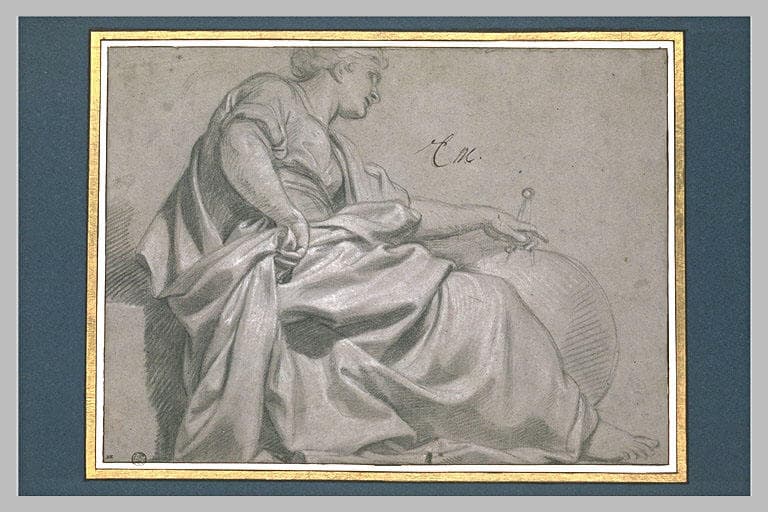 Etude pour le décor de la voussure de l'escalier des Ambassadeurs du château de Versailles, 1674-1679. L'escalier fut détruit, sur ordre de Louis XV, en 1752. Plusieurs gravures du décor ont été réalisées par Etienne Baudet (cuivres à la chalcographie, nos 1007 à 1013), par C. Simonneau l'Aîné (BnF, est., AA5) et par L. Surugue, (BnF, est., Ed. 96a, cuivres à la Chalcographie, nos 1014 à 1017). Le décor de la voussure présente différentes figures, participant à l'exaltation des vertus royales, parmi elles : Apollon, Minerve, Hercule et les Muses. Etude pour Uranie qui fait face à Euterpe, au milieu d'un des petits côtés de la voussure du plafond de l'Escalier (cf. Inv. 28037). Comme dans la version finale, elle tient de la main gauche un compas posé sur un globe, sa main droite retenant un pan de la draperie ; mais la position de la tête, vue ici de profil, sera modifiée, regardant vers le haut et semblant contempler le ciel. L'utilisation de la pierre noire, avec un graphisme vigoureux et appuyé, apparente ce dessin à un carton, malgré ses modestes dimensions. Les ombres fortes accentuent l'aspect sculptural de cette figure dont la draperie sera allégée dans la peinture. (L. Beauvais, Musée du Louvre, Département des Arts graphiques, Inventaire général des dessins, Ecole française, Charles Le Brun, 1619-1690, tome I, Paris, RMN, 2000, n° 356, p. 129)