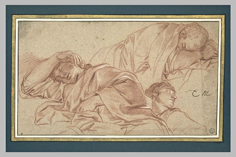 Le tableau Le Christ au jardin des Oliviers a été peint vers 1660 pour Madame du Plessis-Bellière, lors du séjour de Le Brun à Vaux. Ce tableau est aujourd'hui perdu mais il en existe de nombreuses copies. Au cours de circonstances inconnues, le tableau, ou peut-être une copie retouchée par Le Brun, a été donné à la Reine-mère Anne d'Autriche, pour son oratoire (Jouin, 1889, p. 85, 131-133). Selon Monicart (II, 1720, p. 166), il se trouvait dans la petite galerie de Versailles au début du XVIIIè siècle. Il a été gravé par G. Rousselet (Weigert, 1965, n° 62) et par C. Duflos (BnF, est., Da 37). Etude pour les trois disciples endormis, tels qu'ils apparaissent à gauche du tableau. (L. Beauvais, Musée du Louvre, Département des Arts graphiques, Inventaire général des dessins, Ecole française, Charles Le Brun, 1619-1690, tome I, Paris, RMN, 2000, n° 1329, p. 382)