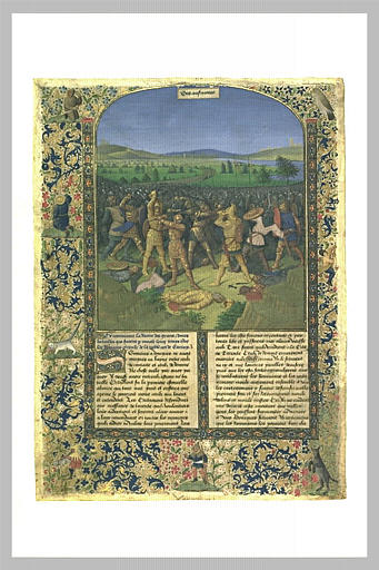 Page enluminée d'un manuscrit démembré et en grande partie perdu de l'Histoire ancienne jusqu'à César et Faits des Romains, compilation française d'histoire antique, dont quatre autres feuillets sont conservés au Louvre (Inv. 4143, 29493, 29494) et au Rijksprentenkabinet d'Amsterdam (Inv. A 1943). Remarquable par son ampleur et sa maîtrise de l'espace, tant en termes de suggestion atmosphérique que d'organisation des plans et des masses, cette représentation d'une bataille entre Romains et Carthaginois appartient sans doute aux dernières années de l'activité tourangelle de Jean Fouquet, après 1470-1475. L'ornementation des bordures revient à une autre main nettement moins habile, dont on a pas encore pu déterminer ni l'identité ni le lieu précis d'activité. Lemoisne, La peinture française XIV, XV, XVI, pp. 18-22. P. Leprieur dans Chronique des Beaux-Arts, 30 Avril 1904