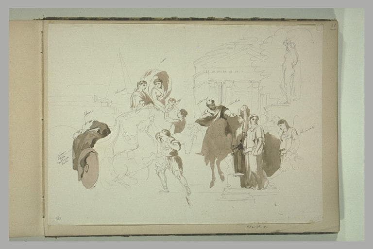 Album Ecole française XIXeme siècle -1-, folio 81, rapporté au recto ; Album factice, cartonné en papier jaspé gris, dos de cuir brun. Paysages, copies d'après des maîtres et d'après l'antique. Certains dessins sont dessinés sur du papier calque. H. 0,277 ; L. 0,385