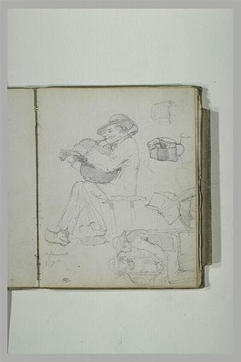 Etudes de divers personnages dont un homme assis jouant de la cornemuse