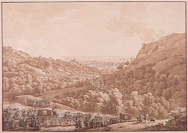 Route serpentant à travers un vallon qui aboutit à une ville ; Voyage de l'Impératrice Marie-Louise en Normandie en Août 1813 - Arrivée du cortège aux portes de Cherbourg - L'Impératrice recevant l'hommage de la délégation chargée de l'accueillir aux portes de la ville (autre titre) - POP