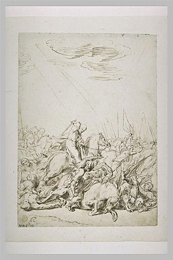 Cette oeuvre et la Conversion de saint Paul (Louvre, RF 24315) font partie d'un groupe de six dessins : les autres illustrent Le Martyre de sainte Catherine (Florence, Offices), La Décollation de saint Jean-Baptiste (Florence, Offices), Le Martyre de saint Philippe (Hambourg, Kunsthalle) et surtout L'Erection de la Croix (Florence, Offices, n. 1713 E) qui comporte l'inscription autographe de 1665, déterminant par conséquent la datation de la série vers 1665. Ces dessins ont des dimensions comparables, réalisés dans la même technique sur un papier très fin et de très bonne qualité, ils sont tous signés du même monogramme. La légende apocryphe de saint Jacques monté sur un cheval blanc, vainqueur des Maures (matamoros) commandés par Abd-er-Rahman et apparu au roi Ramire Ier la veille de la bataille de Clavijo (844 apr. J.-C.), fut un thème très courant en Espagne où saint Jacques est un héros symbolique de la Reconquête et le saint patron du royaume. Seul un rayon de lumière vient donner à la scène un caractère surnaturel et miraculeux. (L. Boubli et A. E. Perez Sanchez, dans cat. exp. Dessins espagnols : Maîtres des XVIe et XVIIe siècles, Paris, Musée du Louvre, 1991, n°116) (L. Boubli, Musée du Louvre, Département des Arts graphiques, inventaire Général des dessins de l'Ecole espagnole, XVIe-XVIIIe siècles, Paris, 2002, RMN, n° 56, p. 73, 74)