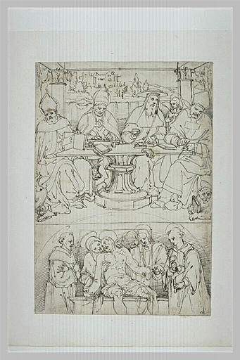 Reconnu par Ph. Pouncey comme une copie de Perino del Vaga d'après le tableau peint par Francesco Sacchi dans l'église de S. Giovanni de Prè, à Gênes, et rapproché d'une autre feuille de l'artiste avec des études des figures, conservée à Londres (British Museum, inv. 1855-7-14-68 ; Ph. Pouncey, J. Gere, Italian drawings in the Department of Prints and Drawings in the British Museum, Raphael and his circle, II vol., Londres, 1962, I, p. 161, n° 272 et II, p. 272, fig. 255). La Mise au tombeau, cintrée à la plume et à l'encre noire et située dans la partie basse de la feuille, témoigne de l'image de la lunette qui couronnait le tableau, aujourd'hui dispersée (cat. exp. E. Parma Armani, Perino del Vaga tra Raffaello e Michelangelo, Mantoue, Palazzo Te, 18 mars -10 juin 2001, Milan, 2001, n° 33).