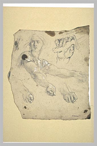 Femme, vue en buste, de trois quarts, les bras tendus ; main tenant une épée
