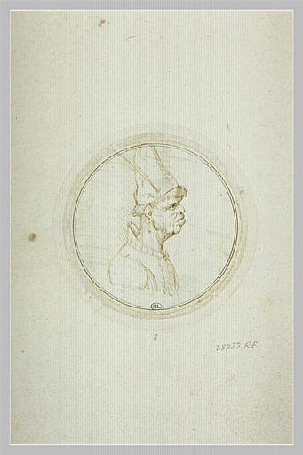 Album Vinci Leonardo -1-, folio 8, rapporté au verso ; Album relié en chagrin noir, portant sur le plat supérieur l'inscription : TRONIEN GETEKEND DOOR LIONARDO DA VINCI ; comprend 32 feuillets, avec 61 dessins rapportés, dont 38 sont d'après des têtes grotesques de Léonard de Vinci. La reliure est datée vers 1700 à Amsterdam. H. 0,333 ; L. 0,241. Les dessins ont été gravés à l'eau-forte par le comte de Caylus et reliés en album (cf. RF 28786). L'album est commenté par P. J. Mariette in ' Lettre sur Léonard de Vinci, peintre florentin. A monsieur le C. de C. ', Paris, 1730. ; Plume, encre brune et lavis gris. Numéro 8 annoté sous le dessin, correspondant à l'eau-forte par le comte de Caylus (RF 28786, folio 17 recto)