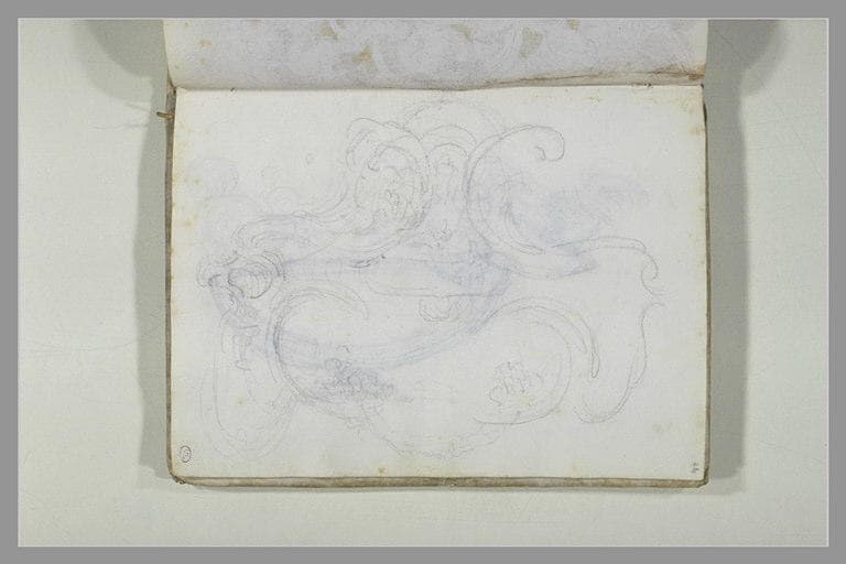 Ce motif de rinceaux pourrait être une première pensée pour ceux dont Petitot orna le cintre surmontant les portes de la grande salle du palais de Colono (G. Cirillo et G. Godi, in cat. exp. Feste, Fontane, Festoni a Parma nel Settecento, Parme, Biblioteca Galleria Palatina, et Rome, Centre culturel français, Galleria Piazza Navona, 1989, p. 62, n° 34, repr. p. 63). Projet portant au verso le dessin de Deux coqs s'affrontant de part et d'autre d'un vase, avec reprise du coq placé à gauche. (J.-F. Méjanès, Musée du Louvre, Cabinet des dessins - Inventaire Général des dessins français, Lettre P, Paris, 1997, R.M.N., n° 1232, p. 310.)
