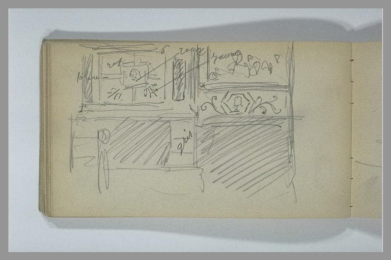 Album Yvon Adolphe -9-, folio 26, dessiné au verso ; Carnet relié de toile beige, avec porte-crayon. Il comprend 50 feuillets. Une étiquette,A la palette de Rubens / Vve de ST Martin & frère / toile & couleurs / tableaux / rue de Seine n° 4, est collée sur le contreplat de derrière. H : 0,102 ; L : 0,177. ; Indications de couleurs à la mine de plomb