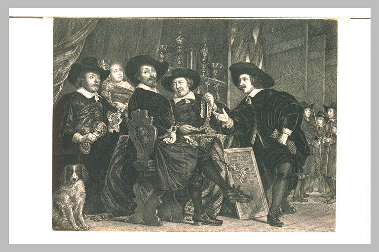 Dessin pour une gravure, d'après le tableau par B. van der Helst, Les cinq gouverneurs de la Garde Civile de saint Sébastien, conservé au Rijksmuseum d'Amsterdam. Reversement du Musée National d'Art Moderne (AM 015D).
