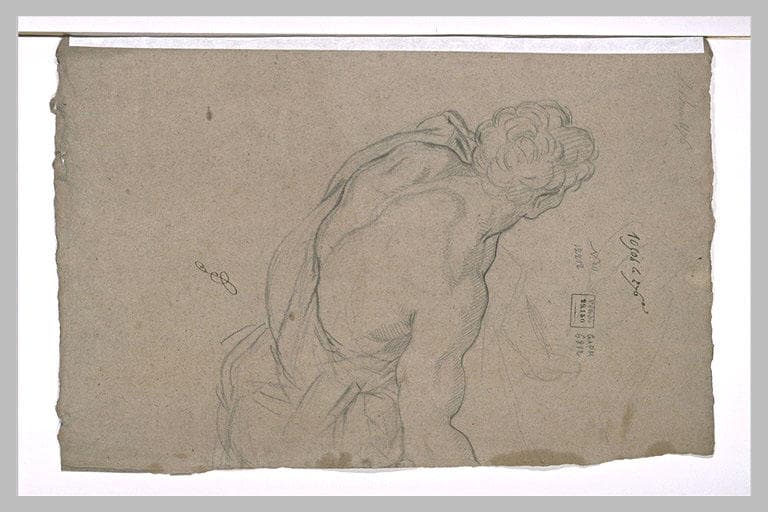 Etude pour Alexandre et Porus ou La Défaite de Porus (musée du Louvre, Inv. 2897). Après la victoire d'Alexandre sur Porus - au terme de la bataille menée sur les bords de l'Hydaspe (Jhelam ou Jhelum) - ce dernier est amené devant le vainqueur. Le tableau fut gravé par Gérard Audran (cuivre à la Chalcographie, n° 1000). Le succès des Reines de Perse - peint par Le Brun à la demande de Louis XIV, à Fontainebleau, en 1660-1661 - incite l'artiste à entreprendre un grand cycle sur la vie d'Alexandre, il réalise plusieurs toiles entre 1665 et 1673. Le Cabinet des dessins du Louvre conserve plus de deux cents dessins relatifs aux peintures de L'Histoire d'Alexandre, dont une soixantaine concernant le tableau d'Alexandre et Porus. Cette étude pour une figure vue presque de dos, à mi-jambes, est peut-être une première pensée pour l'un des prisonniers indiens, à gauche dans le tableau. (Beauvais, Louvre, Inventaire général des dessins, Ecole française, Charles Le Brun, 1619-1690, tome I, 2000, n° 1867, p. 508) Dessin porté au verso d'une autre étude pour le tableau